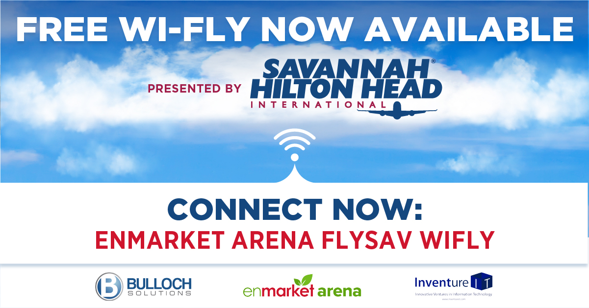 We’re excited to announce that free public Wi-Fi will be available to all guests and fans at visiting the Enmarket Arena! All those that wish to connect to Enmarket Arena Wi-Fly, presented by Savannah/Hilton Head International Airport, can do so for free using the network ‘Enmarket Arena flySAV Wi-Fly’ when at the Arena.
